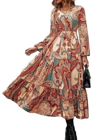 Women’s Printed Boho Maxi Dress | Long Flared Style with Full or Puff Sleeves | Ethnic Pattern Gown for Festive, Holiday & Everyday Wear