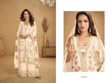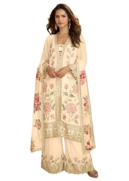 Women’s Designer Chinon Silk Sharara Suit Set, Embroidery Kurti with Sharara and Dupatta 18141 (ST06)
