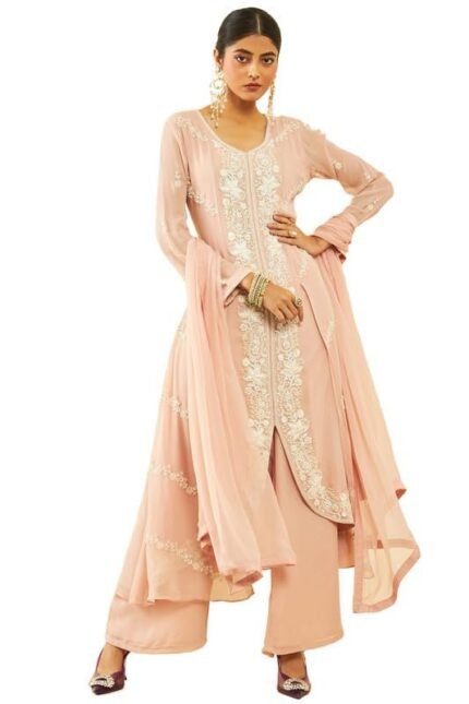 Womens Blush Pink Georgette Embellished Kaftan Suit With Cutdana