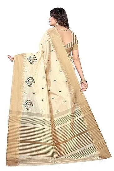 Women’s Assam Cotton Silk With Golden Border Thread Embroidery Saree With Blouse Piece
